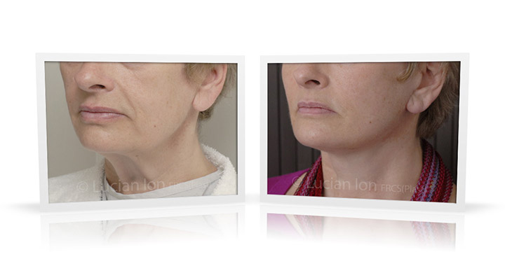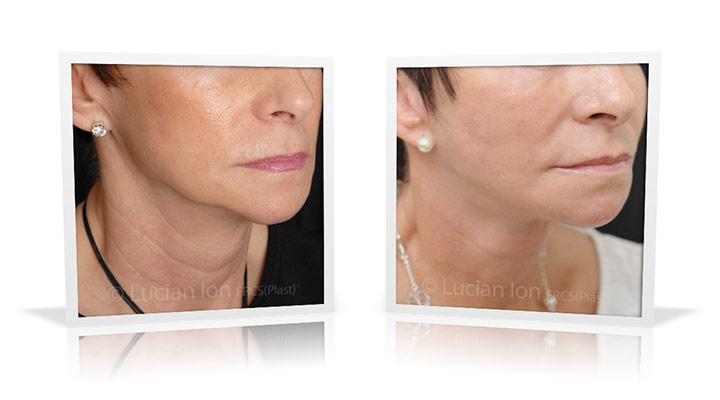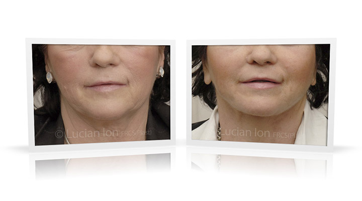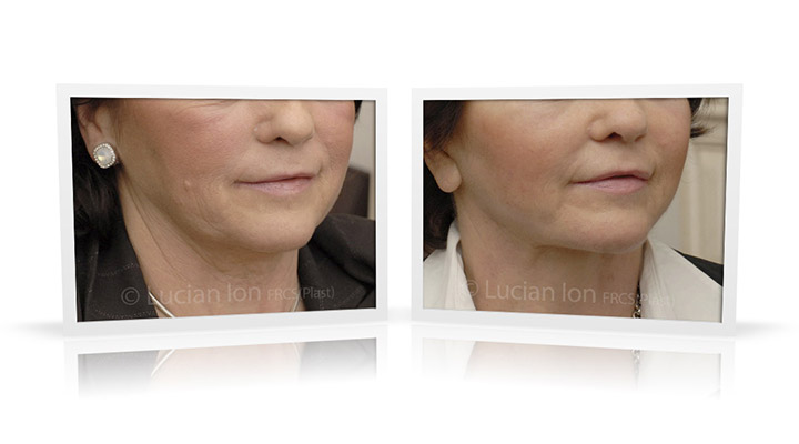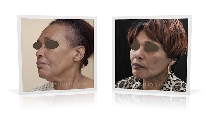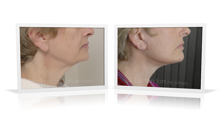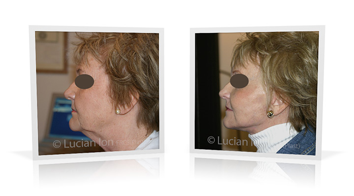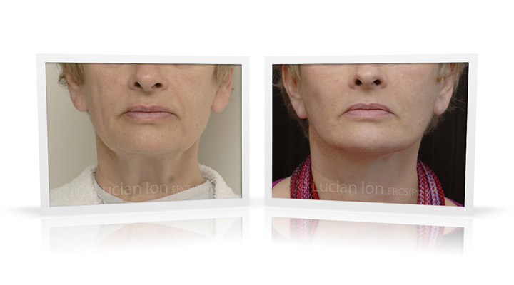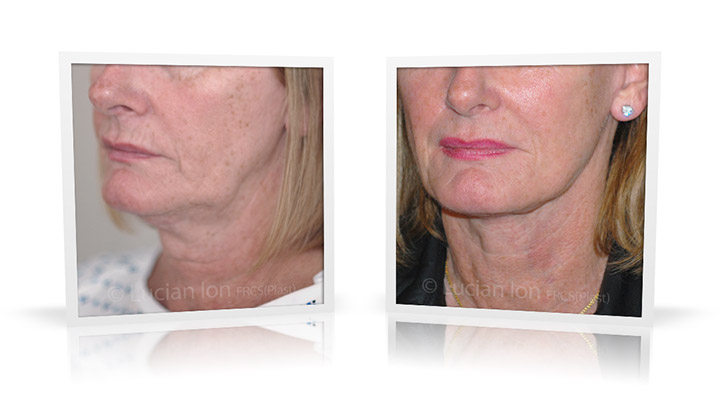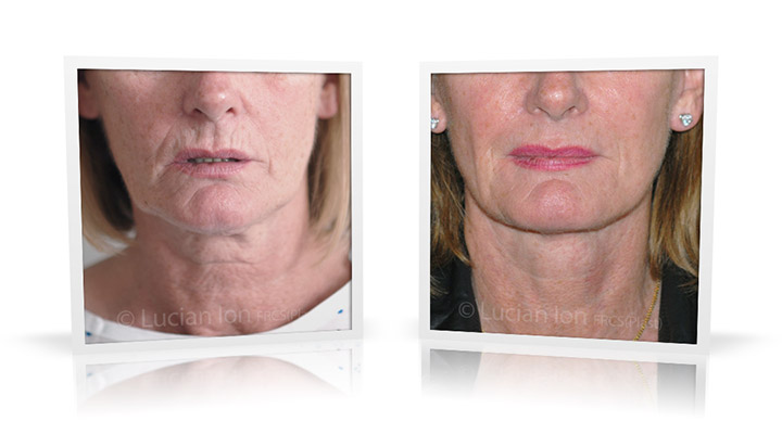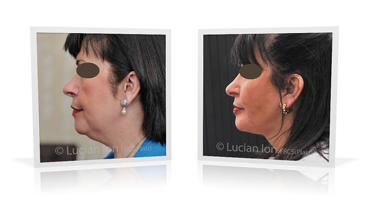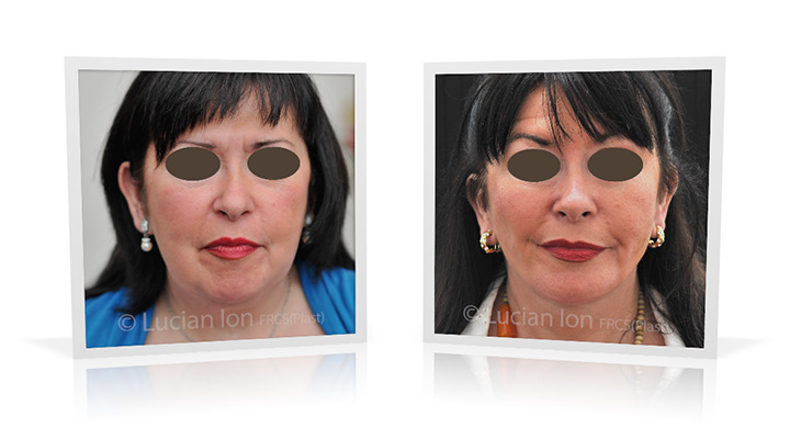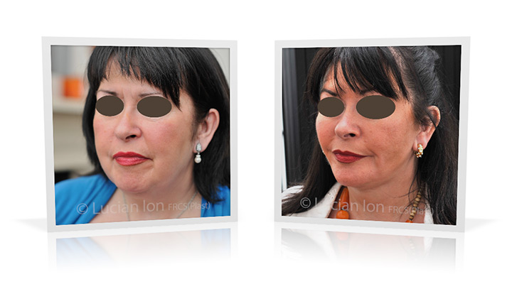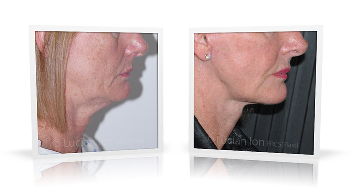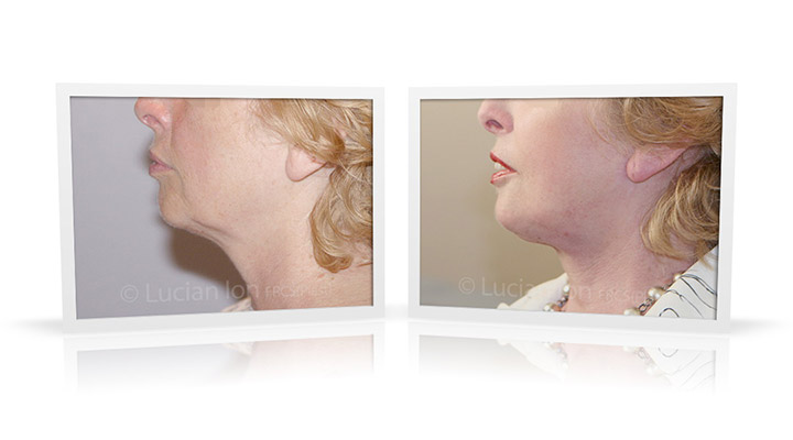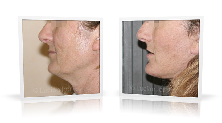 47 | Secondary facelift with Neck lift with platysma plasty, contouring of the submandibular glands and deep layer of fatty tissue in the neck (one year follow-up photo). | ![]() ![]() |