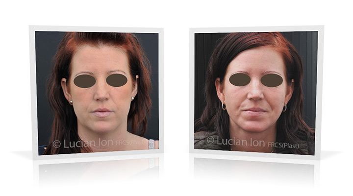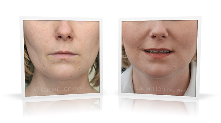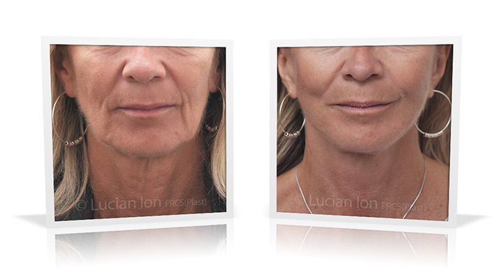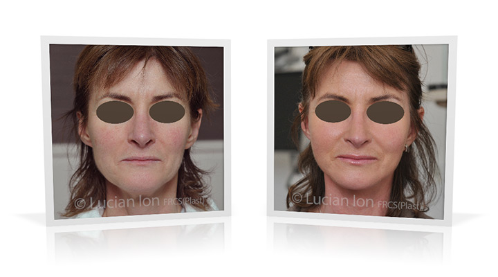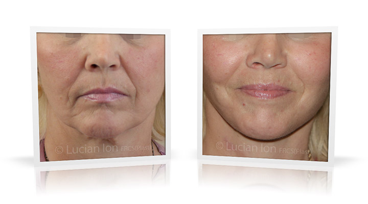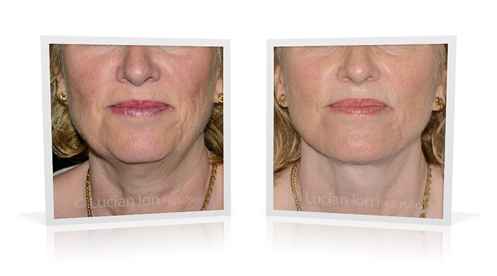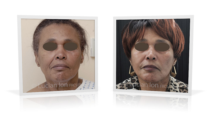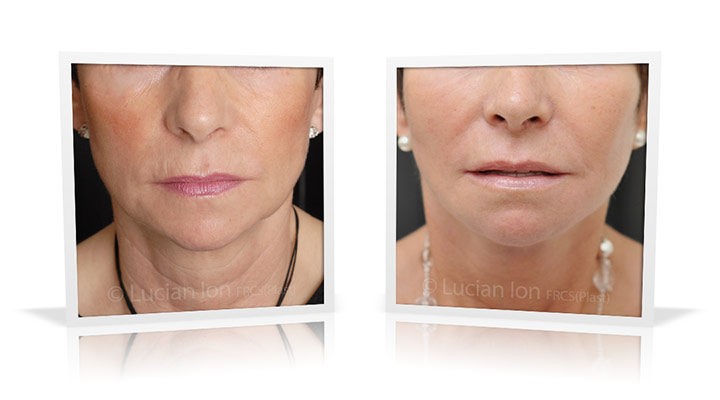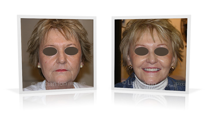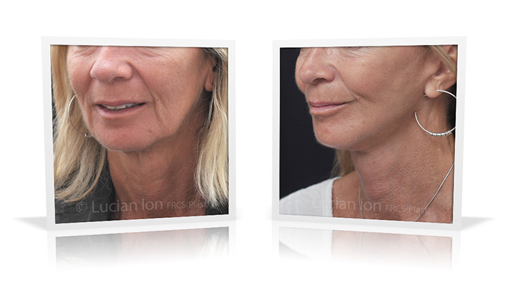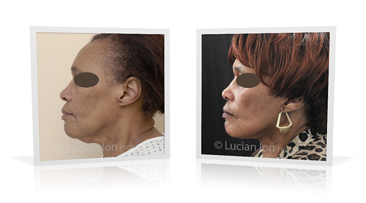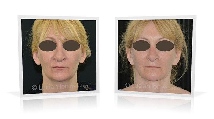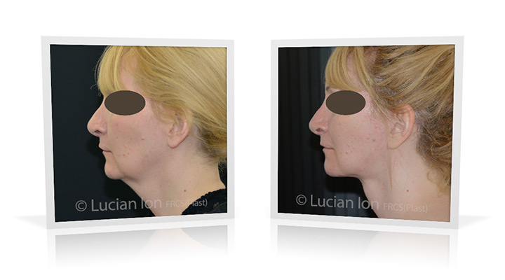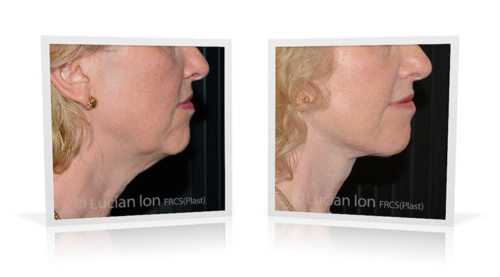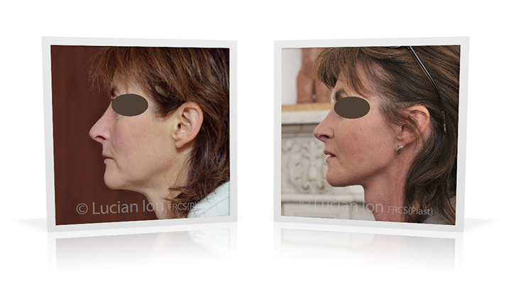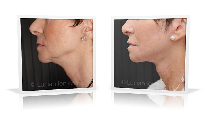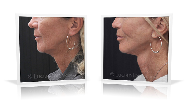 47 | Secondary facelift with Neck lift with platysma plasty, contouring of the submandibular glands and deep layer of fatty tissue in the neck (one year follow-up photo). | ![]() ![]() |